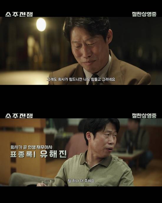 '소주전쟁'은 1997년 IMF 외환위기, 소주 회사가 곧 인생인 재무이사 종록(유해진 분)과 오로지 성과만 추구하는 글로벌 투자사 직원 인범(이제훈)이 대한민국 국민 소주의 운명을 걸고 맞서는 이야기를 담은 영화다. 유해진은 회사가 곧 인생인 재무이사 표종록 역을 연기했다.