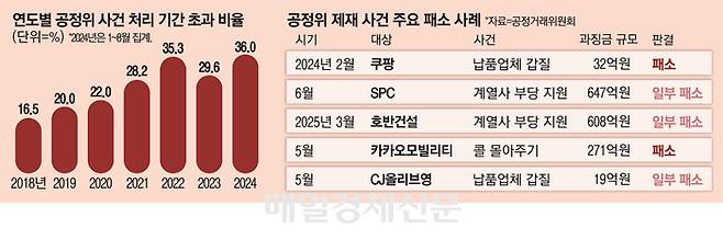 공정위 제재 역시 법원에서 잇따라 제동이 걸렸다. 지난달 서울고등법원은 공정위가 카카오모빌리티의 콜 몰아주기 혐의에 대해 부과한 과징금 271억원을 취소하라고 판결했다. 지난 3월에는 호반건설이 공공택지 전매 등으로 계열사를 부당 지원한 혐의로 부과받았던 과징금 608억원 중 365억원을 취소하라는 판단을 받았다. 지난해 대법원에서는 SPC가 계열사를 부당 지원한 혐의로 받았던 647억원의 과징금 제재가 최종 취소됐다.