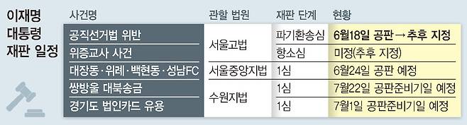 서울고법 형사7부(재판장 이재권)가 9일 헌법 84조(대통령 불소추특권)를 근거로 이재명 대통령의 공직선거법 위반 파기환송심 재판을 대통령 임기 이후로 미루면서, 남은 4건의 재판 일정에 관심이 쏠리고 있다. 가장 민감한 사건인 선거법 위반 파기환송심이 미뤄졌지만, 이 대통령의 ‘재판 리스크’를 명확하게 해소하기 위해 여당은 재판 정지를 법률로 못박는 형사소송법 개정을 예정대로 추진할 계획이다.