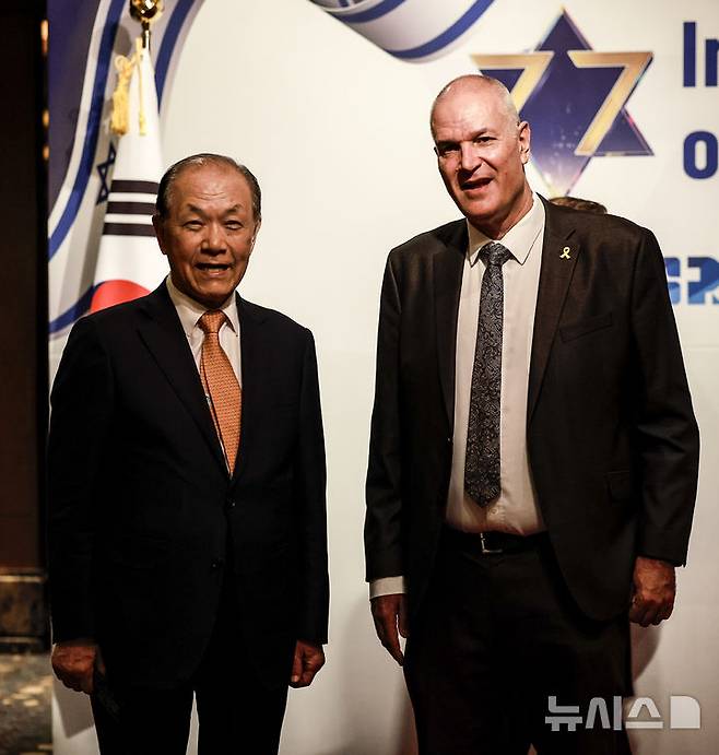 [서울=뉴시스] 정병혁 기자 = 라파엘 하르페즈 주한 이스라엘 대사가 9일 서울 중구 롯데호텔에서 열린 이스라엘 독립 77주년 기념행사에서 황우여 한-이 친선협회 회장과 사진을 찍고 있다. 2025.06.09. jhope@newsis.com