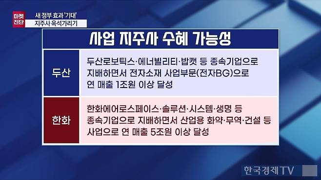 박 이사는 두산을 대표적인 사례로 꼽았다. 박 이사는 "두산로보틱스, 두산밥캣 등을 많이 가지고 있는데 전자소재 사업 부문, 두산전자BG, 비즈니스 그룹 등 사업 부문을 가지고 있는 회사"라며 "(이런 점이 알려지지 않아) 그동안 주가가 많이 억눌려 있었다"고 분석했다. 이어 "한화 같은 경우도 마찬가지"라며 "사업 내용을 뜯어보면 산업용 화약 또는 무역 건설 관련 사업 부문으로 가지고 있는 회사"라고 언급했다.