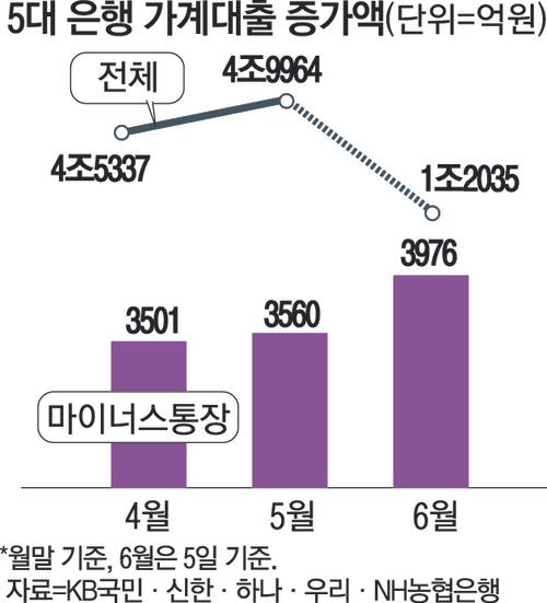 9일 5대 은행(KB국민·신한·하나·우리·NH농협은행)에 따르면 이달 5일 마이너스통장 잔액은 39조3260억원으로 지난 5월 말과 비교해 3976억원 증가했다. 마이너스통장은 고객이 자기 신용도에 따라 개설한 뒤 한도 내에서 자유롭게 쓰고 갚을 수 있는 신용대출이다. 마이너스통장 잔액은 지난 4월 말 한 달 새 3501억원 늘어난 뒤 5월 말에도 3560억원 증가하며 신장세를 지속하고 있다.