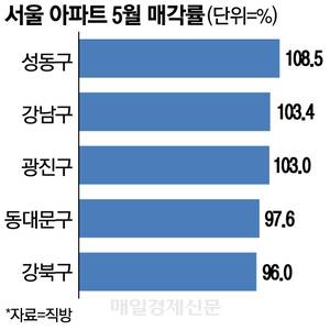 9일 직방이 법원경매정보를 분석한 결과에 따르면 올해 5월 기준 서울 아파트의 평균 매각가율은 96.5%로 2022년 6월(103.0%) 이후 3년 만에 가장 높은 수준을 기록했다.