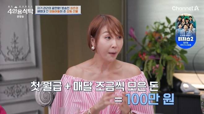 이날 최은경은 해병대에 자원입대한 아들에 대해 "내 성격을 아니까 걱정할까 봐 가기 전에 얘기했다"라고 밝혔다. 최은경은 아들의 첫 월급을 받은 걸 언급하며 "매달 모아서 100만 원을 만들어서 줬다. 죽어도 못 쓰겠더라. 내가 키운 애가 용돈을 준다는 게 너무 이상했다"라며 감동받은 사연을 공개했다. 이어 오브제처럼 보관 중인 아들의 용돈 봉투를 자랑하기도.