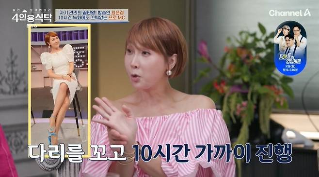 그러면서 최은경은 "영희는 나한테도 고마워해야 한다. 녹화가 길어지면 다리가 벌어지기 시작한다. 그럼 내가 오므리라고 말해준다"라고 했다. 그러자 김영희는 "항상 언니가 외형적으로 잡아줬다. 언니는 하루에 2번 녹화해도 누가 실로 당기고 있는 것처럼 자세를 유지한다"라며 신기해했다. 이경제가 "심지어 MC 자리는 스탠드바 자리 아니냐. 미니스커트 입으니까 신경 쓰이고"라고 하자 최은경은 "진짜 힘들다. 다리를 뱀처럼 꼬고 있어야 한다. 10시간 있었다"고 토로했다.
