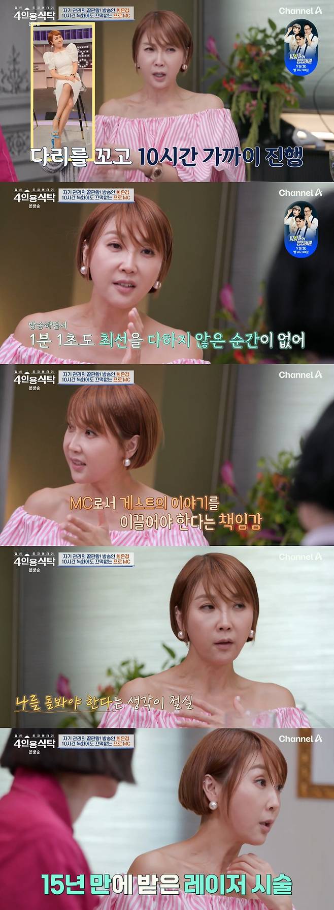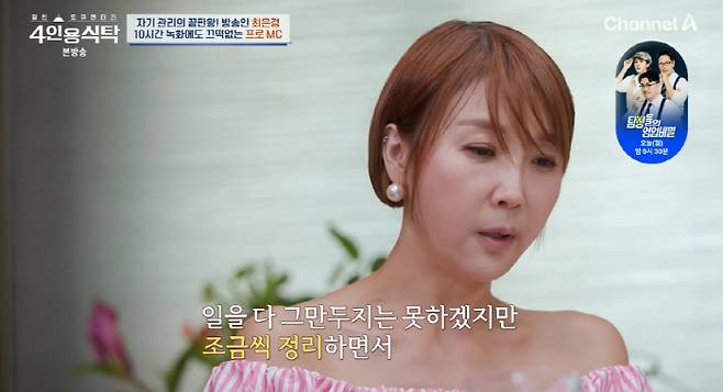 9일 방송된 채널A '절친 토큐멘터리-4인용식탁'에서는 최은경이 한의사 이경제, 개그우먼 김영희, 방송인 김새롬을 집으로 초대해서 모임을 가지는 모습이 그려졌다.