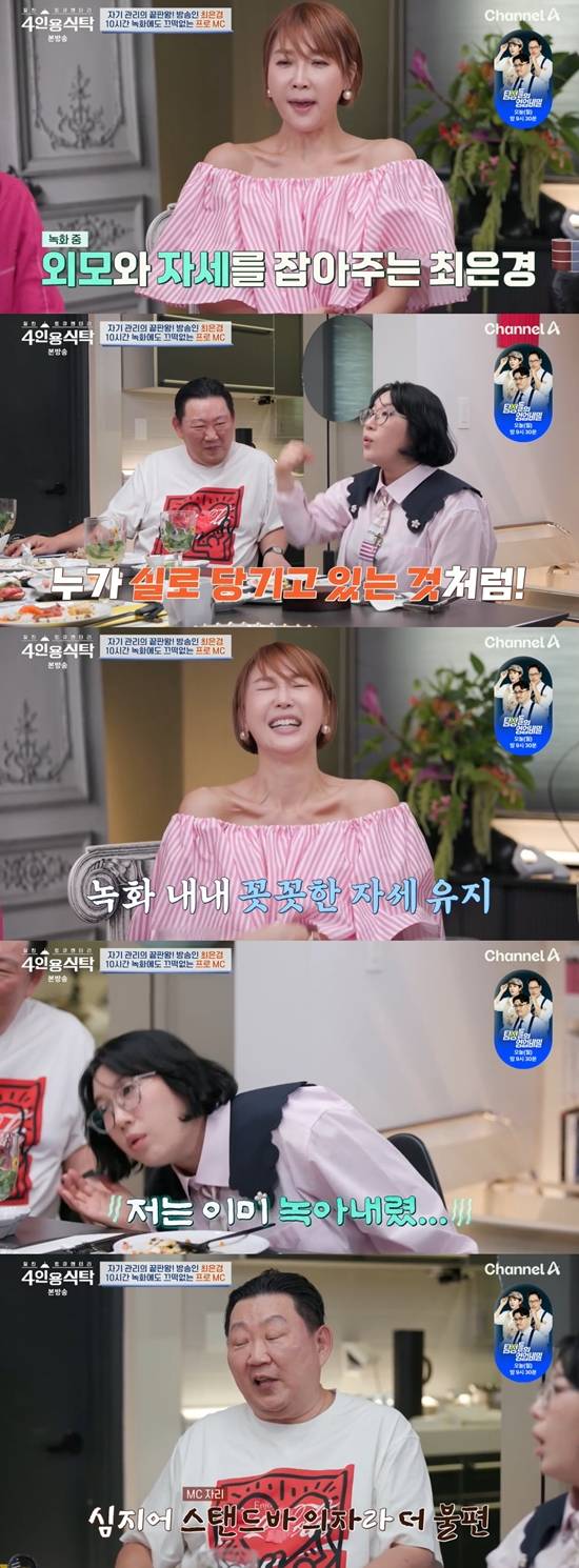 김영희는 "언니가 항상 외형적으로 잡아줬다. 나도 놀랐다. 언니가 긴 시간 동안 누가 실로 당기고 있는 것처럼 허리가 (꼿꼿했다). 나는 이미 녹아있었다. 똑같은 텐션으로 진행했다"라며 최은경의 자세에 감탄했다. 이경제는 "MC 의자는 스탠드바 의자다. 미니스커트 입으면 신경 쓰인다. 10시간을 했다. 요즘은 쉬냐"라며 최은경에게 질문했다.