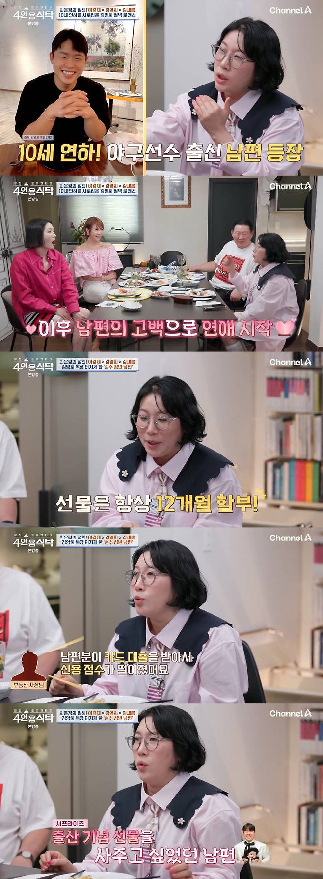 1년 연애 후 결혼한 김영희는 "남편과 결혼을 하겠다고 생각한 건 연애 4개월 때쯤이었다. 너무 착하고 밝다. 세상 물정을 하나도 모른다. 정말 아무것도 모른다"고 말했다. 이에 최은경은 "남편이 김영희에게 잘해주려고 카드 대출을 받았다더라"고 전해 현장을 폭소케 했다.