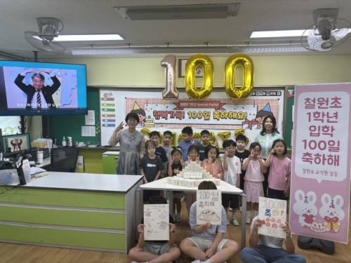 철원초가 1학년 학생들의 입학 100일을 기념하는 '행복맞이 100일 축하 행사'를 열고 학생들의 건강한 성장을 응원했다.