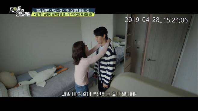 주인공은 탐정단의 권유에 '설마' 하는 마음으로 집안에 홈캠을 설치했다. 그런데 그 안에 담긴 영상은 충격 그 이상이었다. 남편과 방문 교사가 주인공이 없는 틈을 이용해 딸의 방에서 불륜 행각을 벌이고 있었던 것이다. 주인공은 "어떻게 내 딸 침대에서... 미치지 않고서야 어떻게 이런 짓을 할 수 있냐"라며 크게 분노했다. 그리고 이어서 밝혀진 사실들에 '탐정들의 영업비밀' 스튜디오는 멘붕에 빠졌다. 웬만한 사건에는 눈도 깜짝하지 않는 데프콘, 유인나, 김풍 그리고 현직 변호사 남성태마저 경악하게 만들었다.