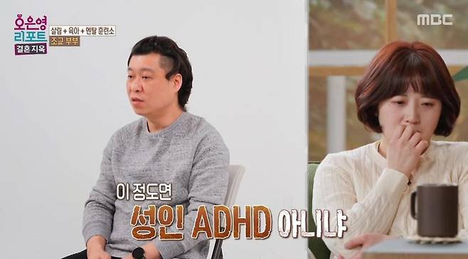 남편은 "집안일하는 걸 보면 답답하다. 계속 바쁜데 일이 크게 줄어있지 않다. 냄비가 끓어 넘치는데도 모른다. 이 정도면 성인 ADHD 아니냐"라고 반격했다.