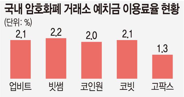 9일 업계에 따르면 국내 암호화폐 거래소들의 예치금 이용료율은 지난해부터 현재까지 대체로 2% 이상을 유지하고 있다. 빗썸 연 2.2%, 업비트와 코빗 2.1% 코인원 2.0% 등이다. 예치금 이용료는 투자자가 거래소에 원화를 넣어두면 이를 거래소가 보호·운영하고 이에 대해 이자를 지급하는 제도다. 만기가 없고 자유롭게 입출금이 가능해 은행의 파킹통장과 비교된다.