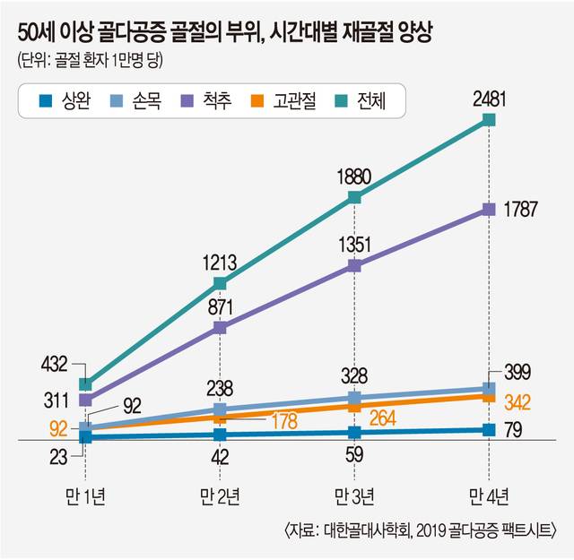 더구나 한번 골절을 경험하면 1~2년 안에 추가 골절이 발생할 위험이 크다. 첫 골절 이후 1년 내 재골절 확률은 5배 높은 것으로 보고된다. 또 2개 이상 다발성 골절을 겪은 환자는 2년 안에 추가 골절 발생 확률이 17.3%로 1개 골절만 가진 사람(10.4%)보다 높았다. 학회가 발간한 2019년 팩트시트를 보면 골다공증 골절 경험 후 재골절 발생은 만 4년까지 꾸준히 이어졌다. 재골절은 척추, 손목, 고관절, 위팔 순으로 많았다. 백 이사장은 “연간 골절 경험자 40만명의 3분의 1 정도가 1~2년 내 재발 가능성이 큰 초고위험군에 해당한다”고 말했다.