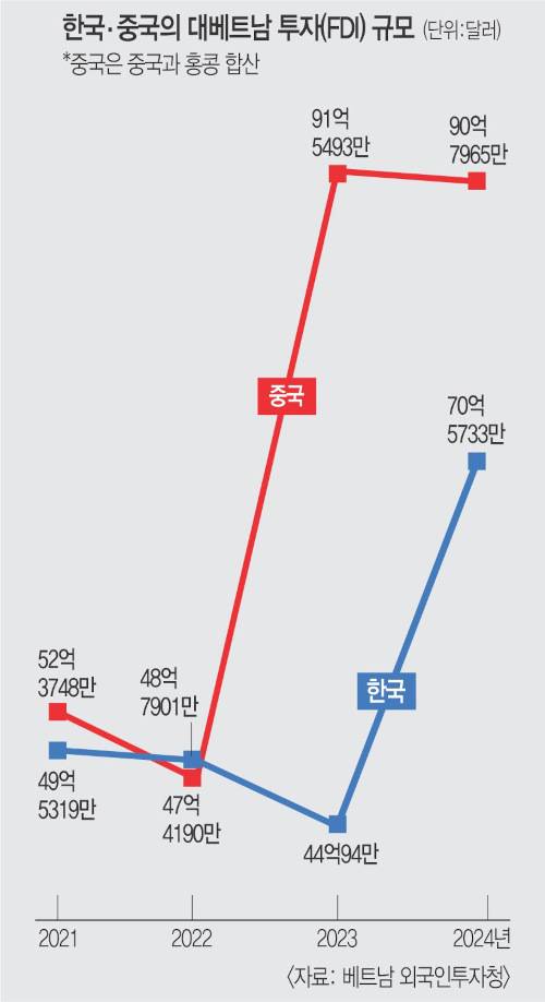 중국 기업들의 베트남 진출은 2017년 미국 도널드 트럼프 1기 행정부 출범 이후 고율의 대중국 관세를 피하기 위한 전략 차원에서 확대됐다. BYD, BOE, TCL 등 중국 제조 대기업들은 최근 베트남에 대규모 공장을 완공했거나 추가 증설을 진행하고 있다. 베트남 외국인투자청에 따르면 대(對)베트남 외국인직접투자(FDI) 규모가 2022년만 해도 한국이 중국보다 1억3711억 달러 더 많았지만, 지난해에는 중국 90억7965만 달러, 한국 70억5733만 달러로 역전됐다.