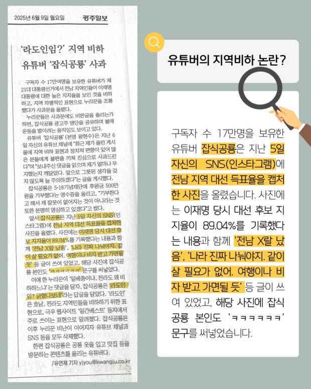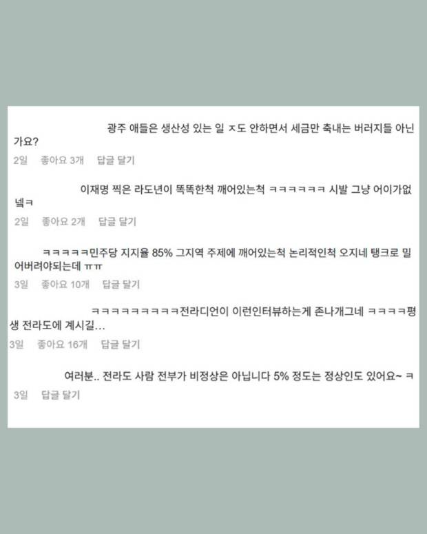 사진에는 이재명 당시 대선 후보 지지율이 89.04%를 기록했다는 내용과 함께 ‘전남 X랄 났음’, ‘나라 진짜 나눠야지. 같이 살 필요가 없어. 여행이나 비자 받고 가면될 듯’ 등 글이 쓰여 있었고, 해당 사진에 잡식공룡 본인도 ‘ㅋㅋㅋㅋㅋㅋ’ 문구를 써넣었습니다.