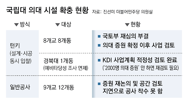 9일 교육부가 국회 교육위원회 소속 진선미 더불어민주당 의원실에 제출한 자료에 따르면 교육부는 올 1월 국토부에 국립대 의대 8개교 8개동 신축 공사 집행 기본계획을 제출했다. 국토부는 ‘설계·시공 일괄입찰(턴키)’ 방식으로 입찰 방법 심의를 진행했다. 턴키는 설계와 시공을 일괄해 입찰에 부치는 제도로, 설계 및 시공 시간이 크게 단축된다. 설계와 시공 단계에 고난도 기술이 필요한 경우 국토부 중앙건설기술심의위원회 심의를 거쳐 선정된다.