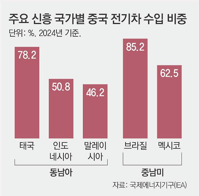 중국의 신흥국 전기차 시장 확대는 현대자동차그룹으로선 달갑지 않은 상황이다. 한국 내수시장도 올해 비야디 진출 이후 중국 저가 전기차 영향력이 확대될 것이란 전망이 나온다. 비야디는 연초 아토3를 3150만 원으로 출시했고, 보조금을 적용하면 이 차의 구매 가격은 2000만 원대로 낮아진다.