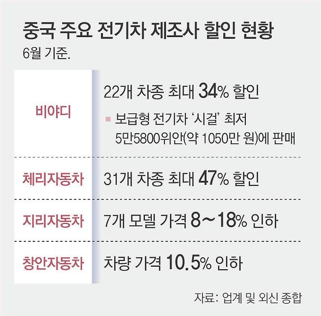 중국 전기차 1위 업체 비야디(BYD)가 촉발한 극심한 가격 경쟁에 중국 정부가 이례적으로 개입했다. 당국까지 나설 정도로 심각해진 ‘치킨게임’이 전 세계 전기차 시장의 가격 폭락과 업계 재편을 가속할 것이란 분석이 나온다.