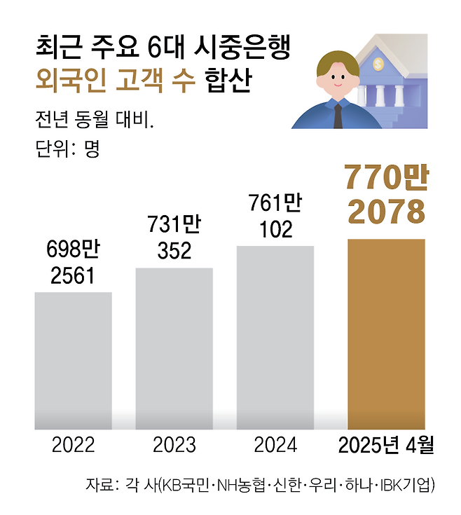 9일 6대 주요 시중은행(KB국민, 신한, 하나, 우리, NH농협, IBK기업)에 따르면 4월 기준 해당 은행의 외국인 고객 수는 770만2078명에 달한다. 2022년 698만2561명, 2023년 731만352명, 지난해 761만102명으로 빠르게 늘어나는 추세다.