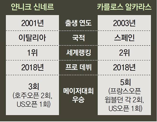 세계랭킹 6위 조코비치는 올해 대회 4강까지 올랐지만 2001년생 얀니크 신네르(24·이탈리아·1위)에게 0-3으로 완패하고 말았다. 신네르와 결승에서 맞붙은 선수는 2003년생 카를로스 알카라스(22·스페인·2위)였다. 메이저 테니스 대회 남자 단식 결승에서 2000년 이후에 태어난 선수끼리 맞붙은 건 이번이 처음이었다. ‘빅4’의 시대가 저물고, 알카라스와 신네르 두 신성의 ‘양강 시대’가 도래한 걸 보여주는 상징적인 장면이었다.