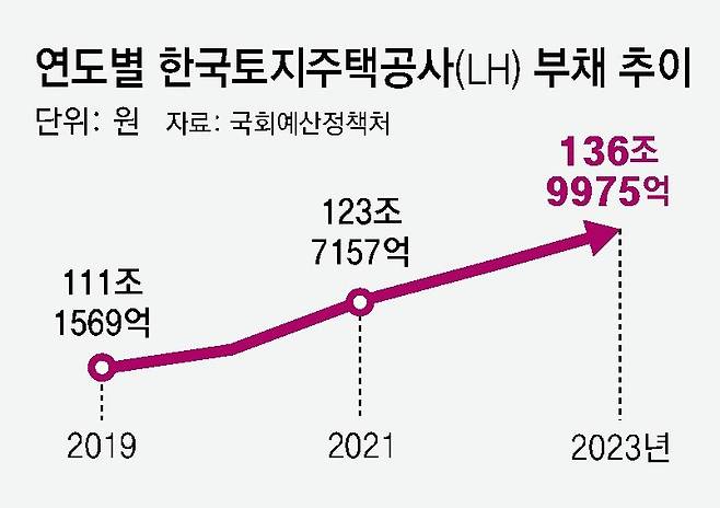 2019년 111조1569억 원이었던 LH 부채는 2023년까지 4년간 25조8407억 원 늘었다.