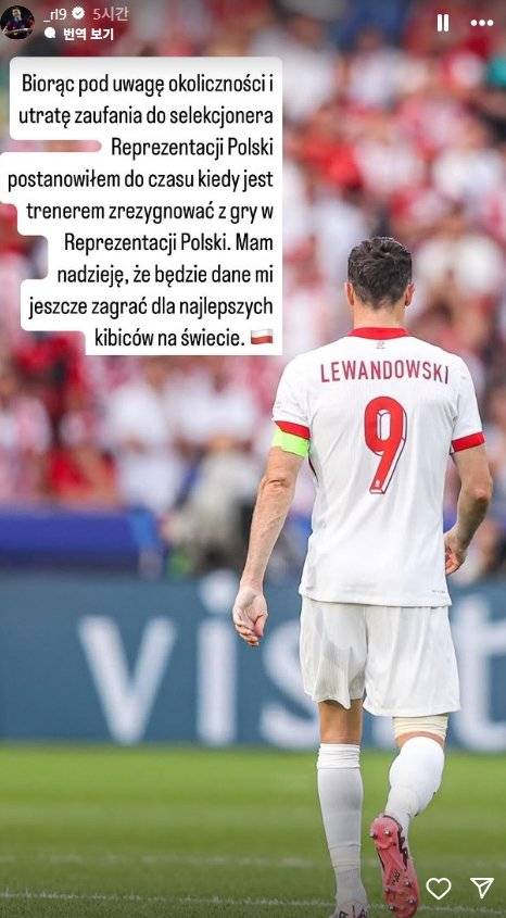 레반도프스키는 9일(한국시간) 자신의 소셜네트워크서비스(SNS)를 통해 “프로비에시 감독에 대한 신뢰를 잃었다. 이를 고려해 프로비에시 감독이 재임 중인 한 국가대표에서 뛰지 않기로 했다”며 “세계 최고의 팬들과 다시 함께하길 바란다”고 밝혔다.