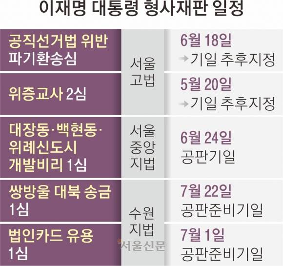이 대통령은 공직선거법 위반 사건 외에도 오는 24일 서울중앙지법 형사합의33부(부장 이진관) 심리로 대장동·백현동·위례신도시 개발 비리 및 성남FC 불법 후원금 의혹 사건 공판이 예정돼 있다. 1심에서 무죄를 선고받은 위증교사 사건 항소심을 맡은 서울고법 형사3부(부장 이승한)는 당초 지난달 20일에 공판을 열 예정이었으나 대선 이후로 기일을 미뤄 둔 상태다. 수원지법 형사11부(부장 송병훈)는 쌍방울 대북 송금 사건과 법인카드 유용 사건의 공판준비 단계를 밟고 있는데 4개의 재판 모두 연기될 가능성이 커졌다.