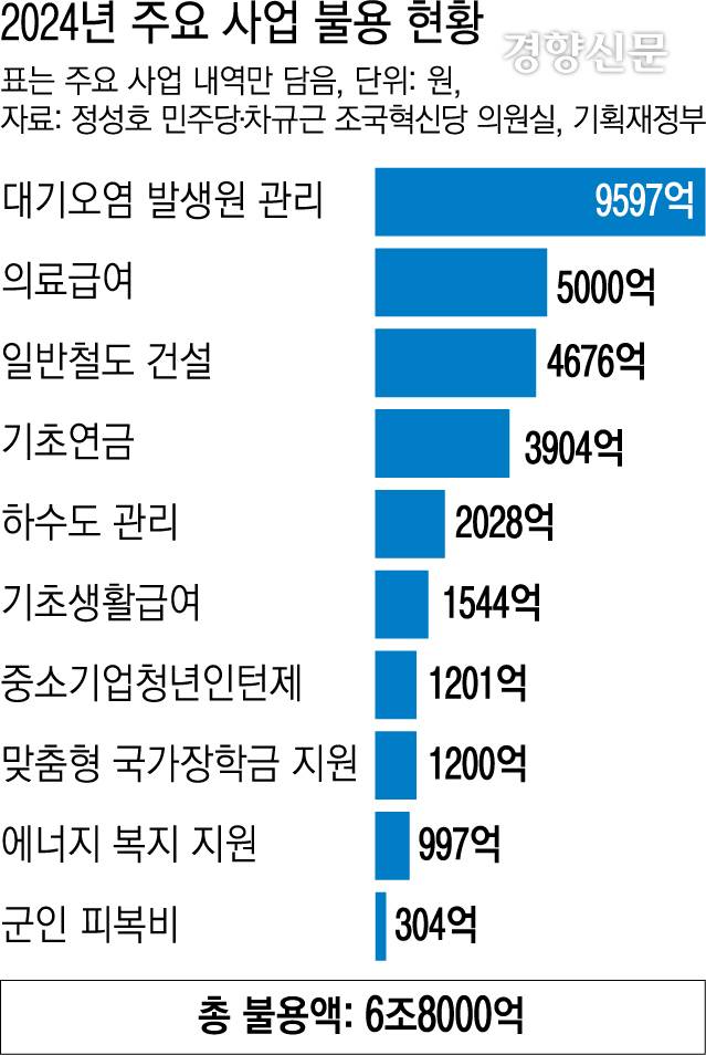 국회 기획재정위원회 소속 정성호 더불어민주당·차규근 조국혁신당 의원이 9일 기획재정부로부터 받은 ‘2024년 세수결손 대응 집행 관련 불용’ 자료를 보면, 대기오염 발생원 관리 사업 예산 9600억원을 쓰지 않은 것으로 나타났다. 하수도 관리(2030억), 지방 상수도 관리(250억원)까지 합치면 약 1조2000억원을 덜 썼다.