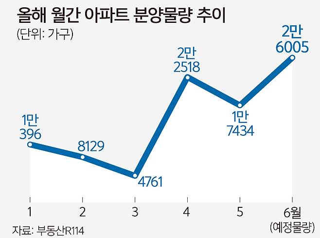 부동산R114 관계자는 “실수요자가 청약통장을 적극적으로 꺼내는 치열한 청약 결과가 나오려면 지방 일대의 경우 지역 미분양 주택 해소가 선결 과제”라며 “월간 기준 최대 물량이 예고된 6월에도 상대적으로 미분양 수준이 적은 수도권 위주로 청약 결과가 준수할 것”이라고 내다봤다.