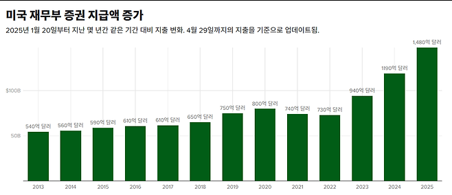 반면 연방 정부의 이자 비용 지출은 급증했다. 트럼프 대통령의 오락가락 관세 정책 등으로 물가가 꿈틀대고 국채 금리가 출렁인 탓이다. 트럼프 대통령 취임 후 100일 동안 연방정부가 지출한 이자 비용은 1480억달러에 달한다. 이는 불과 3년 전인 2022년 같은 기간에 쓴 이자 비용(730억달러)의 두 배에 달하는 액수다.