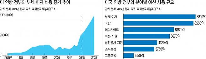 문제는 누적돼 온 정부 부채의 덩치가 너무 커지다 보니, 어느 순간부터 재정 적자에서 이자 비용이 차지하는 비중이 감당하기 어려운 수준으로 확대됐다는 점이다. 2024년 미 정부는 순전히 이자 비용으로만 8810억달러(약 1196조원)를 지출했다. 국방 지출(8550억달러)을 이미 뛰어넘었다. 미 의회예산국(CBO)의 추산에 따르면 미 정부 이자 비용은 올해 9520억달러로 늘어나고, 2026년에는 1조달러로 사상 최고치를 경신한 후, 2035년에는 1조8000억달러를 찍을 것으로 전망된다. 10년 후에는 재정적자의 70%가 순전히 이자를 갚기 위해 내는 빚이 될 것이란 뜻이다.