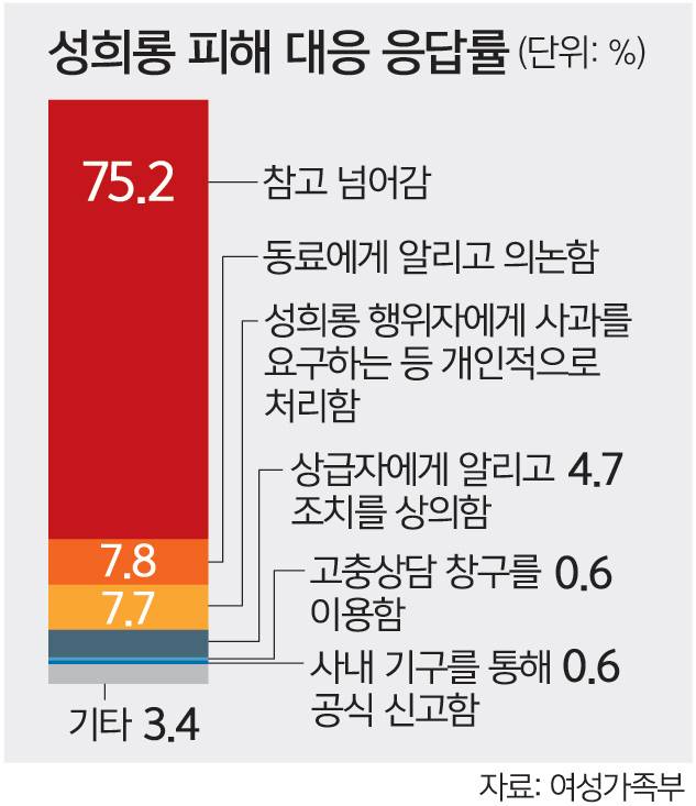 최근 3년간 직장에서 성희롱을 겪은 사람의 75%는 별다른 조처 없이 ‘참고 넘어간’ 것으로 나타났다. 직장 내 성희롱 피해율은 줄었으나 이처럼 ‘참고 넘어간’ 비율은 직전 조사 대비 8.5%포인트나 뛰었다.