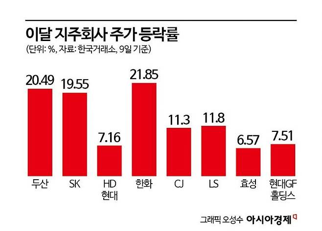 다만 기대감으로 주가가 단기간에 급등한 만큼 추격 매수에는 신중해야 할 것으로 보인다. 은경완 신한투자증권 연구원은 "지주회사 급등 현상은 진정 국면에 진입할 것으로 예상된다"면서 "무분별한 추격 매수보다는 주력 사업 업황, 자체 상승 모멘텀 보유 등을 고려한 선별적 투자가 요구되는 시점"이라고 강조했다.