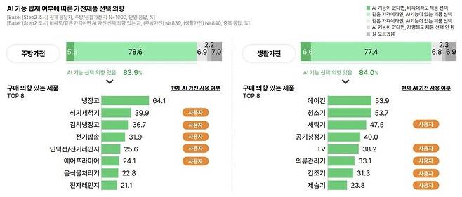 소비자 데이터 플랫폼 오픈서베이가 오늘(10일) 발간한 'AI 가전 트렌드 리포트 2025'에 따르면 지난달 16일부터 21일까지 만 20∼59세 남녀 1천명을 대상으로 조사한 결과, AI 기능이 탑재된 주방가전과 생활가전을 구매할 의향이 있는 응답자는 각각 83.9%, 84.0%로 집계됐습니다.