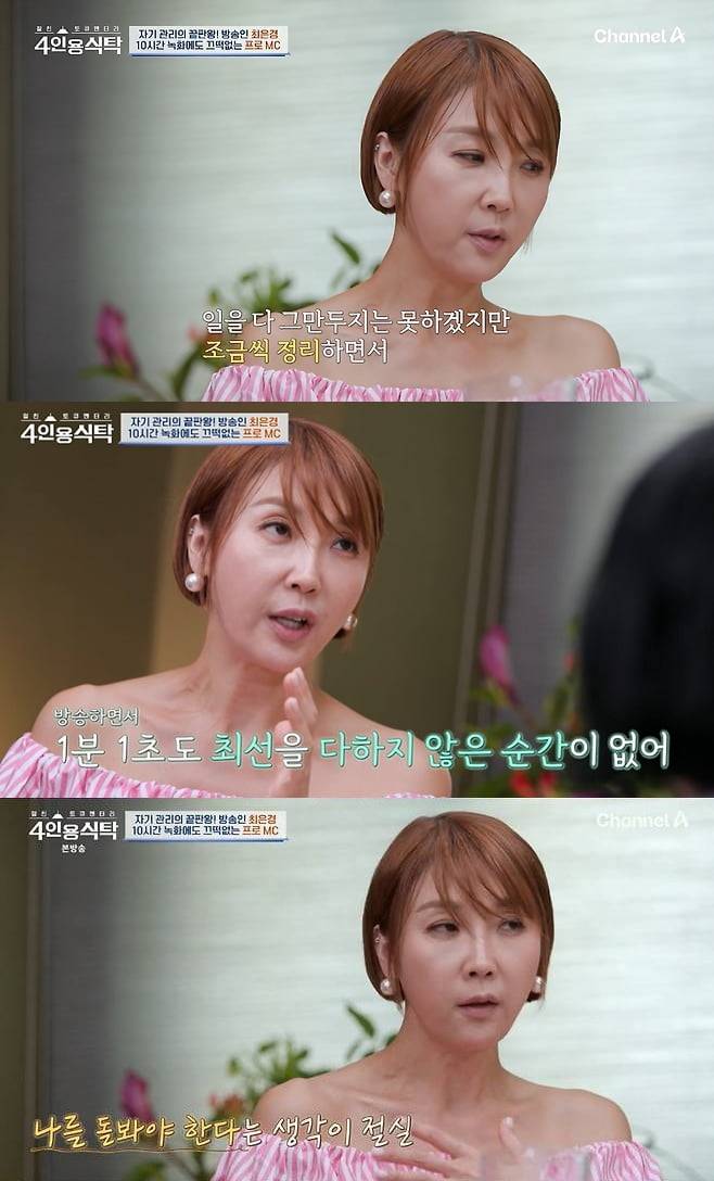 지난 9일 방송된 채널A '절친 토큐멘터리-4인용식탁'에는 최은경이 절친 한의사 이경제, 개그우먼 김영희, 방송인 김새롬을 만나는 모습이 담겼다.