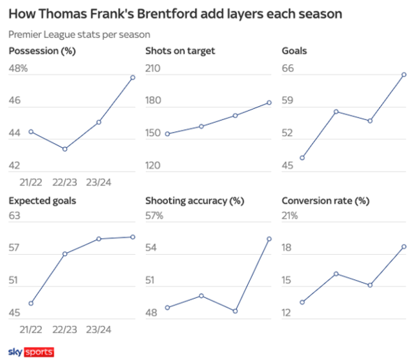 스카이스포츠는 프랑크가 이끈 브렌트포드가 프리미어리그에서 첫 시즌 9위에 올랐던 것을 주목했다. 특히 2시즌 차 리그에서는 4월 말까지 승리가 적었음에도 시즌 최종 9위로 뛰어올랐고, 브라이언 음베우모, 요안 위사, 케빈 샤데 등 3명의 선수가 두 자릿수 득점을 기록했다. 이는 바르셀로나, 바이에른 뮌헨만이 기록한 성과라 더욱 의미가 컸다.