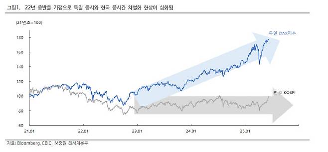 그는 “독일 증시의 급등 현상은 경제 펀더멘털 측면에서만 설명하기 어렵다”며 “한국과 독일의 국내총생산(GDP) 성장률, 물가, 수출 추이에서 큰 차이가 없기 때문에 경기 사이클로 독일 증시 급등을 설명하는 데에는 한계가 있다”고 지적했다.