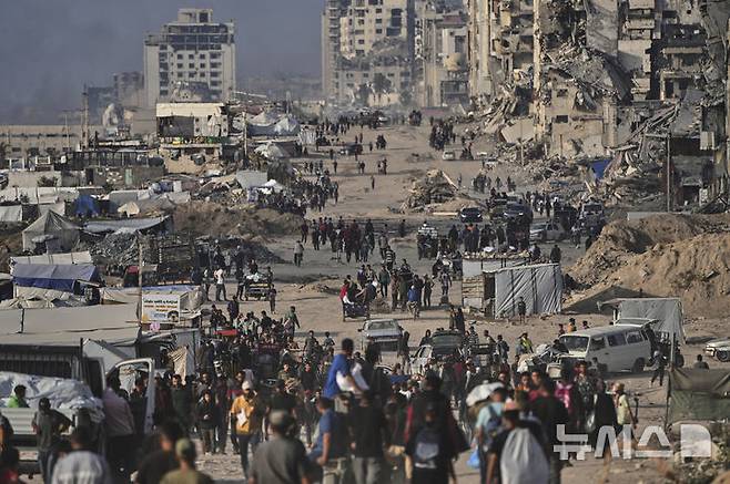 [가자시티=AP/뉴시스] 9일(현지 시간) 가자지구 가자시티에서 팔레스타인 난민들이 파괴된 건물 잔해가 즐비한 해안가를 따라 이동하고 있다. 2025.06.10.