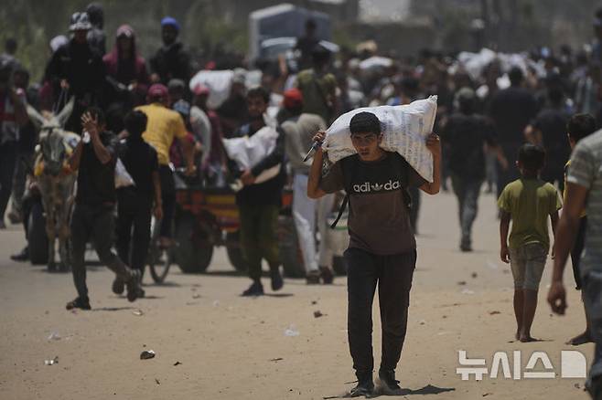 [라파=AP/뉴시스] 9일(현지 시간) 가자지구 남부 라파에서 팔레스타인 주민들이 미국 구호단체 가자인도주의재단(GHF)이 제공한 식량과 구호물자를 받아 나르고 있다. 2025.06.10.