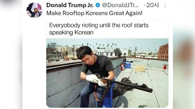 트럼프 대통령의 장남인 도널드 트럼프 주니어는 전날 엑스(X·옛 트위터) 등에 과거 LA 폭동 당시 한인의 모습으로 추정되는 남성의 사진을 올리고 "옥상의 한국인들을 다시 위대하게"(Make Rooftop Koreans Great Again!)라고 썼습니다.