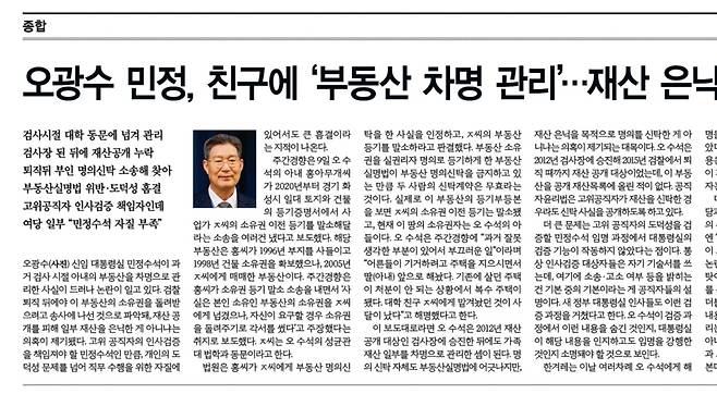 오광수는 "과거 잘못 생각한 부분이 있어서 부끄러운 일"이라며 "어른들이 기거하려고 주택을 지으면서 딸(아내) 앞으로 해놨다. 기존 주택이 처분이 안돼 복수 주택이 됐다. 대학 친구에게 맡겨놨던 게 사달이 났다"고 해명했다.