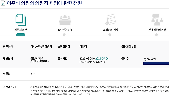 지난 대선 TV 토론에서 성폭력성 발언을 한 개혁신당 이준석 의원을 제명해 달라는 국회 국민 청원 동의자 수가 엿새 만에 48만 명을 넘겼습니다.