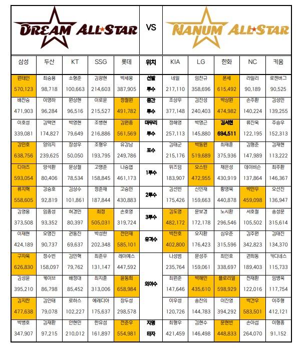 올 시즌 상위권을 지키고 있는 한화 이글스 소속 선수가 나눔 올스타 총 5개 포지션(선발 투수·중간 투수·마무리 투수·외야수·지명타자)에서 1위에 올랐다. LG 트윈스가 포수(박동원) 1루수(오스틴 딘) 외야수(박해민), KIA 타이거즈가 3루수(김도영)과 유격수(박찬호), NC 다이노스가 2루수(박민우)와 외야수 한자리(박건우)에 1위를 뒀다. 드림 올스타에선 삼성 라이온즈가 총 6개 포지션, 롯데가 5개 포지션에서 1위를 지키고 있다.