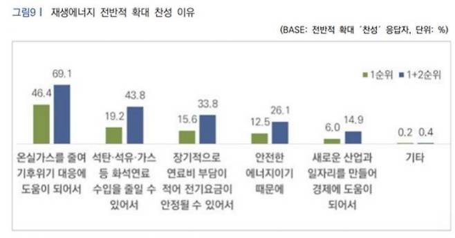 국민들이 재생에너지 확대를 지지하는 구체적인 이유(1+2순위 복수 응답)로는 온실가스를 줄여 기후 위기에 대응(69.1%)하고, 석탄·석유·가스 등 화석연료 수입을 줄이고(43.8%), 장기적으로 연료비 부담이 적어 전기요금이 안정될 수 있어서(33.8%)가 가장 많이 꼽혔다.