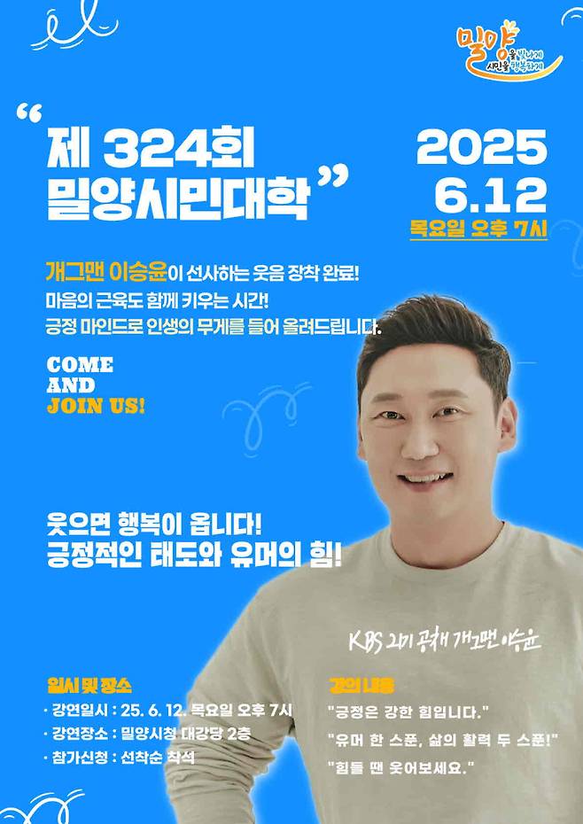 밀양시는 오는 12일 오후 7시 시청 대강당에서 개그맨 이승윤을 초청해 ‘웃으면 행복이 옵니다! 긍정적인 태도와 유머의 힘!’이라는 주제로 특별 강연을 개최한다.