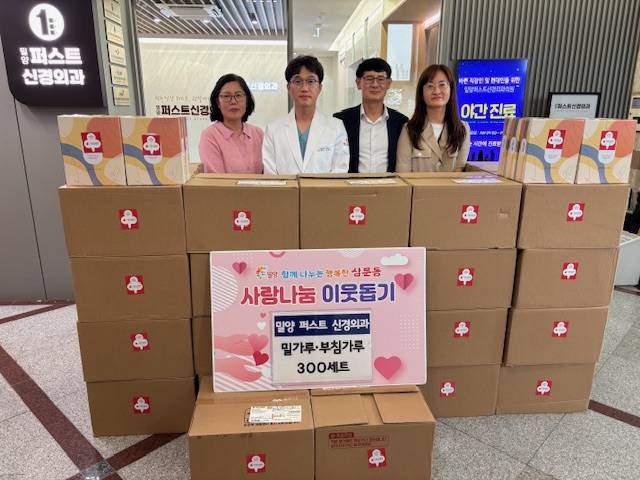 밀양시 삼문동(동장 박용문)은 9일 밀양퍼스트신경외과의원(대표원장 권재은)에서 취약계층에 전달해 달라며 행정복지센터를 방문해 부침가루 선물 세트 300개를 기탁했다.