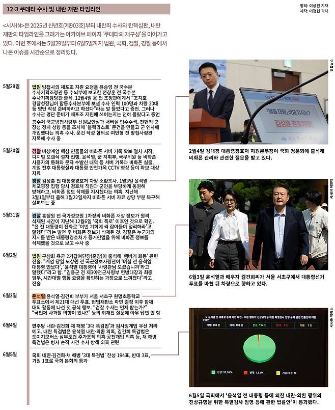 〈시사IN〉은 2025년 신년호(제903호)부터 내란죄 수사와 탄핵심판, 내란 재판의 타임라인을 그려가는 아카이브 페이지 ‘쿠데타의 재구성’을 이어가고 있다. 이번 호에서는 5월29일부터 6월5일까지 법원, 국회, 검찰, 경찰 등에서 나온 이슈들을 시간순으로 정리했다.