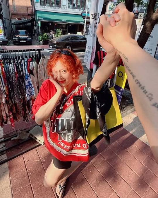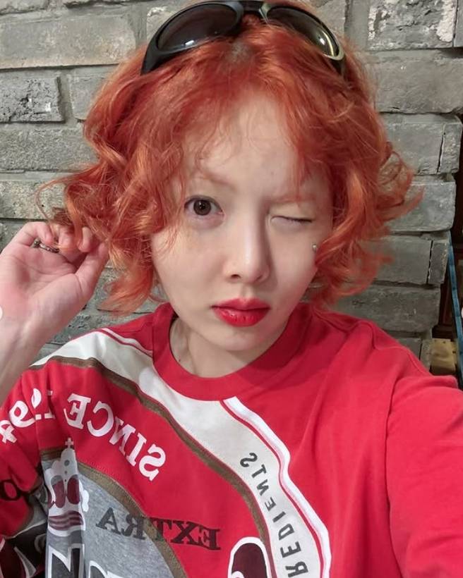 공개된 사진 속 현아는 과감한 오렌지 컬러의 단발 웨이브 헤어로 시선을 사로잡았다. 여기에 눈에 띄는 빈티지 스타일의 빨간색 루즈핏 티셔츠를 착용해 스트리트 감성을 강조했다.