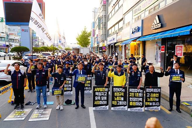 | ▲ 태안화력 비정규직 노동자 사망사고, 정부는 근본 대책 마련하라! 공공운수노조 발전비정규직연대(금화PSC지부, 한국발전기술지부, 한전산업개발발전지부, 발전HPS지부, 일진파워노조, 한전KPS비정규직지회) 대표자들이 9일 오후 서울 용산 대통령실 앞에서 태안화력 고 김충현 비정규직 노동자 사망사고 발전비정규직연대 입장 및 투쟁계획 발표 기자회견을 하고 있다. |