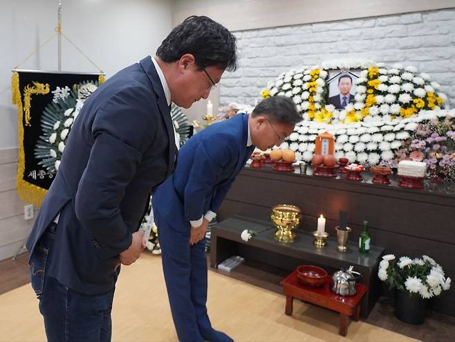 | ▲ 조국혁신당 신장식 국회의원과 황현필 최고위원이 고 김충현 노동자 조문 이후 유족에게 조의를 표하고 있다. |